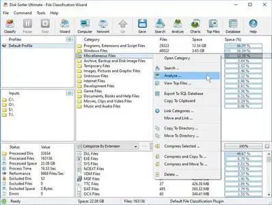 The DiskSorter main GUI application provides the user with the ability to classify one or more disks or directories, analyze, categorize and/or filter file classification results, export file classification reports to the HTML, PDF, Excel, XML, text or CSV formats, copy, move or delete specific file classes, class groups or individual files and much more.