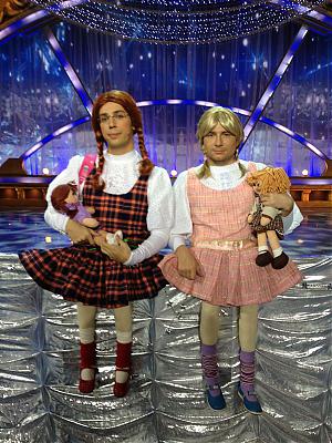 Звезды уже приступили к съемкам многочисленных новогодних огоньков. Из года в год создатели таких передач пытаются чем-нибудь удивить зрителя, к примеру, на этот раз Максима Галкина и Николая Баскова нарядили в маленьких девочек. Из Баскова получилась милая блондинка с косичками, а Галкину достался ярко-рыжий парик.
