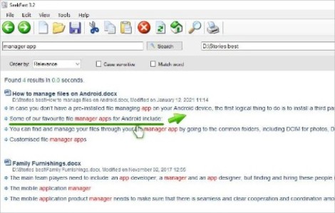 SeekFast is an extremely fast and easy to use program that can search for a text in multiple files in a folder on your computer. If you are using the full version, you will be able to search thousands of documents. Searching is easy and convenient, and although SeekFast has a Help section, the program is easy enough to use without even reading the information in it. All you have to do is choose a directory to search and enter search words or phrases - you will get all the sentences in which they occur in seconds. This is particularly useful if you need to find something quickly.