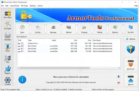 ArmorTools is a set of tools that expands the capabilities of the MS Windows operating system in the field of security and protection of user confidential information. ArmorTools allows you to create secure virtual disks encrypted using AES128/AES256 algorithms, encrypt files and folder contents using any file as a password. ArmorTools removes traces of the user's work on the computer, clears the history of visiting sites, deletes confidential information without the possibility of recovery. It also has a set of additional settings for the MS Windows operating system. ArmorTools contains the following tools: Extra Disks, File Shredder, File Encryptor, Objects Eraser, System Tweaker.
