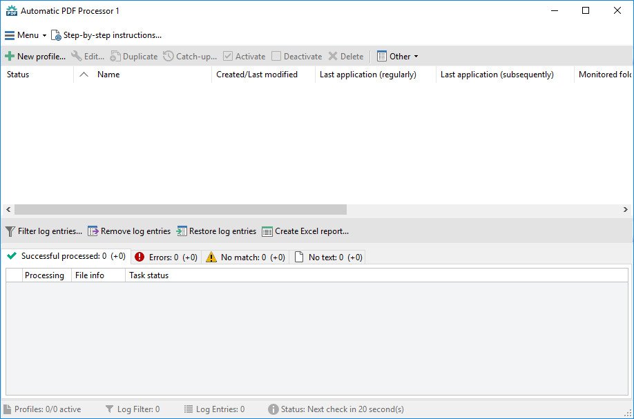 With Automatic PDF Processor, PDF files can be processed automatically. Any number of folders can be monitored in order to automatically print, rename or move incoming PDF files to dynamically named folders. Numerous metadata of the PDF document can be used in addition to the content, for example to include invoice information in the file path. The PDF files to be processed can be narrowed down with various profile-specific filters - the document text, PDF metadata and general file information are available as filters.