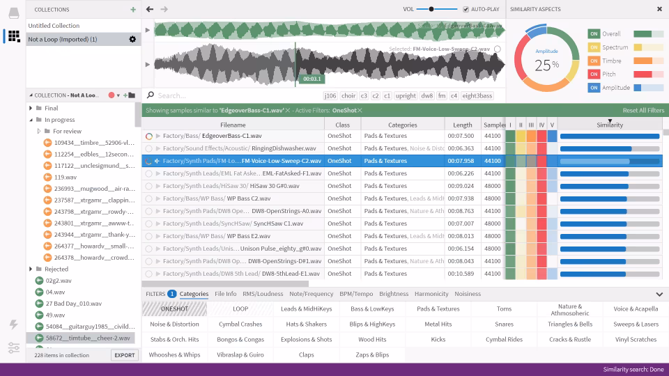 Similarity search enables you to find similar-sounding samples in your sample collection. Basically, pick any sound as input and "see where it takes you" - finding variations has never been this easy. For more control, you can determine how much individual aspects (e.g. similarity across pitch or timbre) should matter.